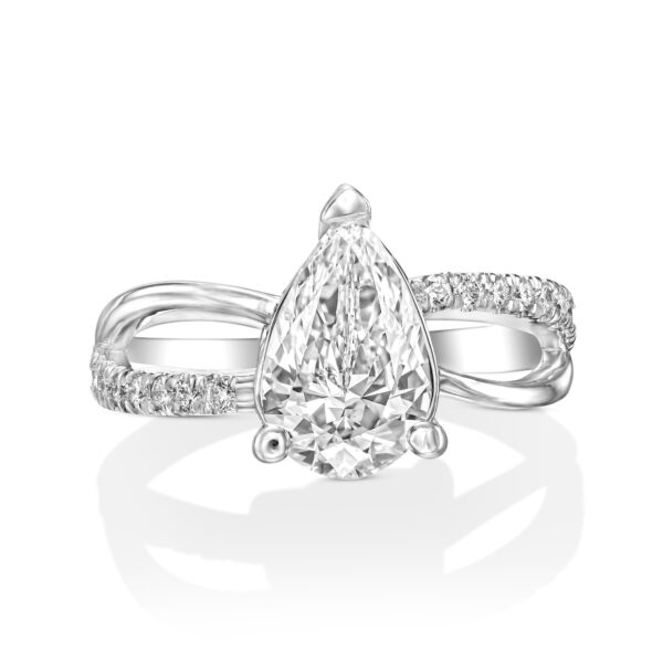 הטבעת מתהדרת ביהלום מרכזי בצורת טיפה וב 14 יהלומים בחיתוך עגול